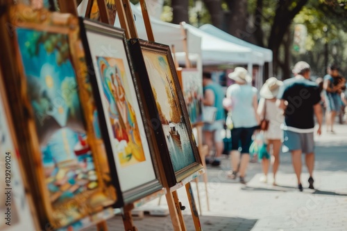 Obraz premium People enjoy artwork at an art festival in a downtown park in a blurry photo