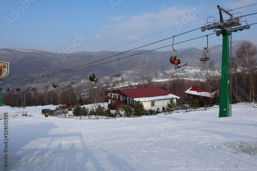 © Nataliia Tomashuk, Obraz premium people enjoy outdoor activities in the mountains, skiing and snowboarding