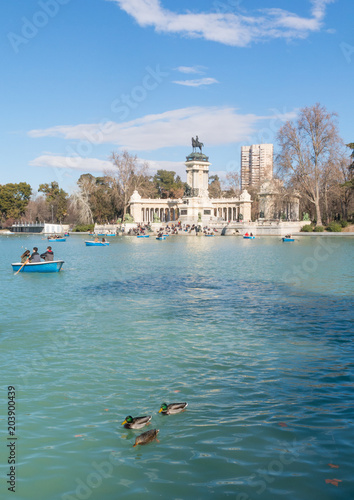 Obraz premium People enjoying a boat ride on the pond in El Retiro Park in Madrid, Spain.