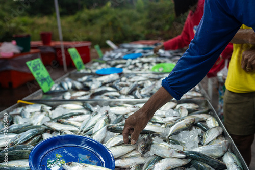 Obraz premium People hand choose and buy tuna seafood fish
