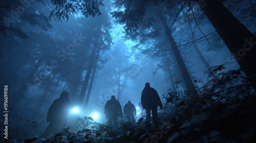 © Aisha, Fototapeta premium People in dense forest, some holding torches, looking for missing person, tense cinematic fog