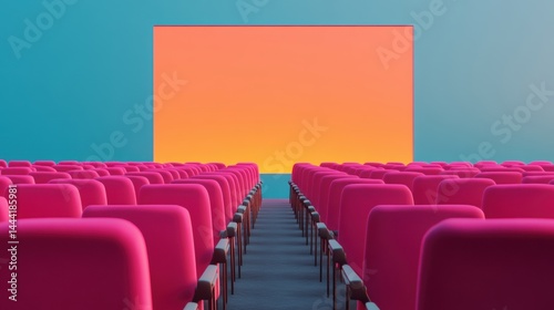 © pornsawan, Fototapeta premium People in the cinema auditorium with Cinema blank wide screen and red chairs in the cinema hall,People silhouettes watching movie performance,empty white screen,space for text,copy space.