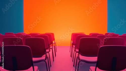© pornsawan, Fototapeta premium People in the cinema auditorium with Cinema blank wide screen and red chairs in the cinema hall,People silhouettes watching movie performance,empty white screen,space for text,copy space.