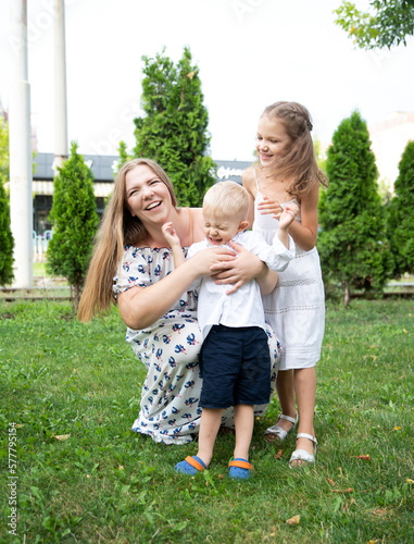 © Анжелика Мельничук, Obraz premium People laugh emotionally. Mom children have fun together.