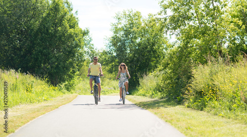 Fototapeta premium people, leisure and lifestyle concept - happy young couple riding bicycles along road in summer