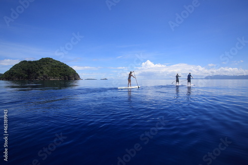 © Neil, Fototapeta premium people paddling sup standup paddle boards in calm blue waters. Philippines