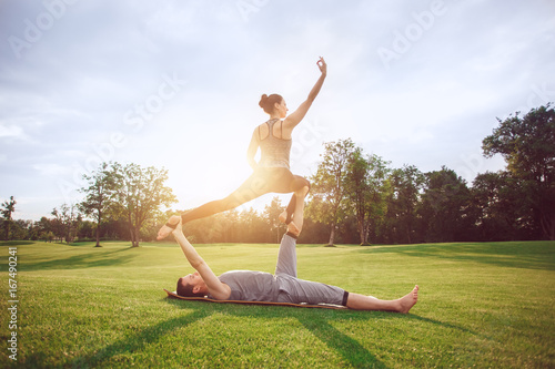 Fototapeta premium People practice acro yoga outdoors healthy lifestyle