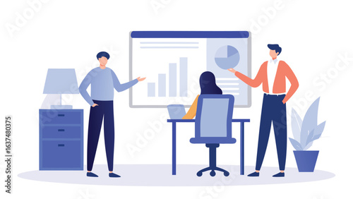 © Ehsan Arts, Obraz premium People presenting business data with a chart and a pie graph in a bright office setting illustration