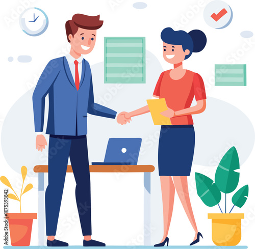 Fototapeta premium People shaking hands at work - Two businesspeople, man and woman doing handshake in office at work while smiling over business agreement and deal. Flat design stock illustration on white background