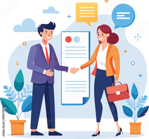 Fototapeta premium People shaking hands at work - Two businesspeople, man and woman doing handshake in office at work while smiling over business agreement and deal. Flat design stock illustration on white background