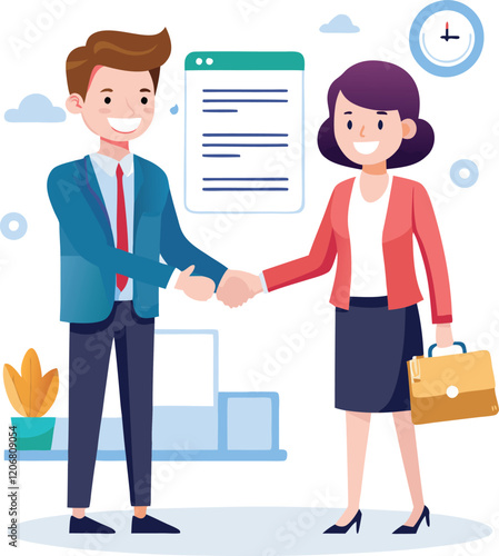 © MDSIAM, Obraz premium People shaking hands at work - Two businesspeople, man and woman doing handshake in office at work while smiling over business agreement and deal. Flat design stock illustration on white background