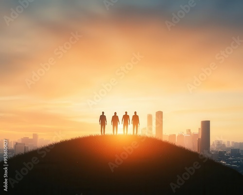 Obraz premium People standing on a grassy hill overlooking a cityscape at sunset, blending...