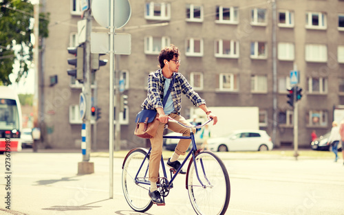 © Syda Productions, Obraz premium people, style, leisure and lifestyle - young hipster man with shoulder bag and earphones riding fixed gear bike on city street