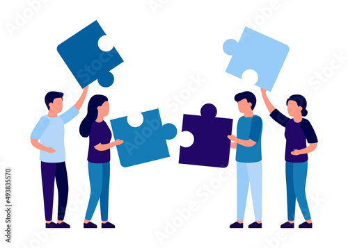 © Iuliia, Fototapeta premium People team assembling parts jigsaw puzzle. Work and business partnership man and woman concept. Team metaphor. Symbol of teamwork, cooperation, partnership, team building. Vector illustration