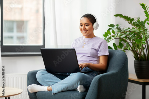 © Syda Productions, Naklejka premium people, technology and leisure concept - happy young african american woman in headphones with laptop computer listening to music at home