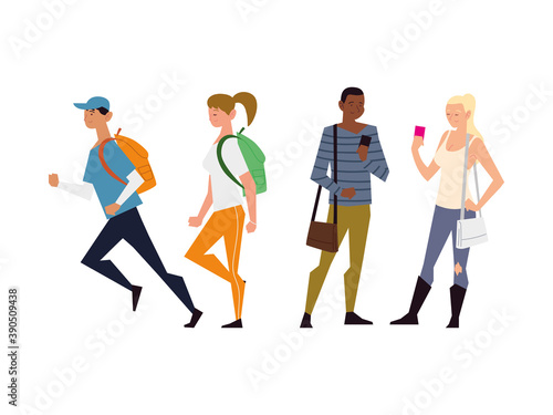 © djvstock, Obraz premium people using smartphone and walking activity