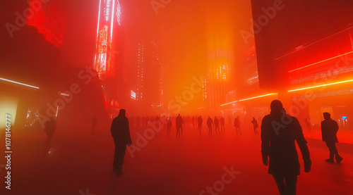 Obraz premium People walk through a city street at night, illuminated by red neon lights, creating an ethereal glow