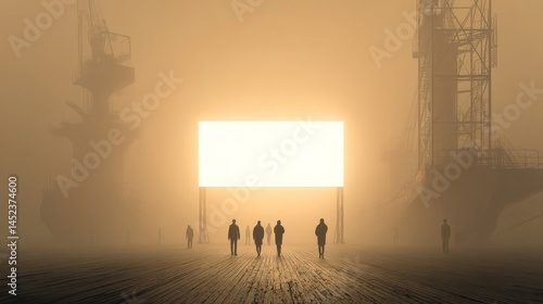 © Fluke, Naklejka premium People Walking in Foggy Environment Near Bright Empty Billboards