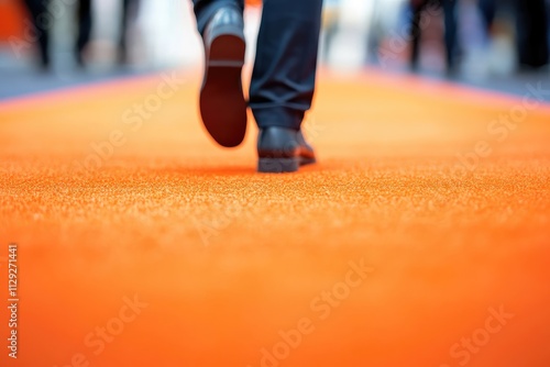 Naklejka premium People walking on an orange carpet in a modern building.