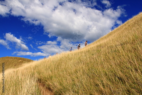 Fototapeta premium People walking up grassy hill