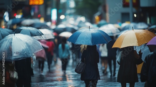 © kinara art design, Obraz premium People walking with umbrellas in the rain on a city street.