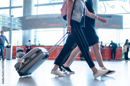 © Наталия Бражник, Fototapeta premium people wearing medical masks walking with luggage bags suitcases at the airport travel concept. High quality photo