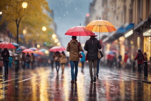 Obraz premium people with an umbrella on the street in raining. ai generative