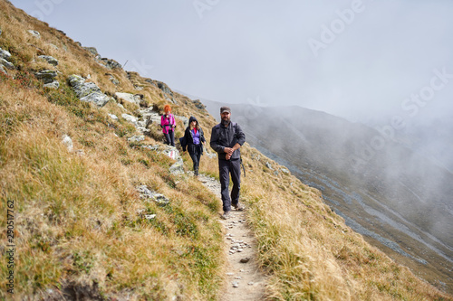 © Xalanx, Fototapeta premium People with backpacks hiking into the mountains