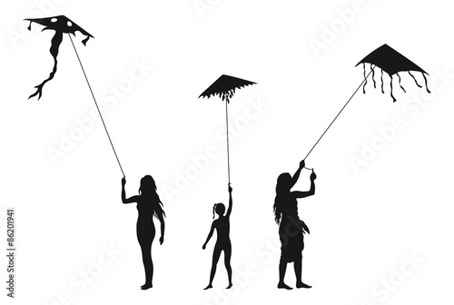 © oksanaok, Obraz premium People with Flying Kites, Silhouettes