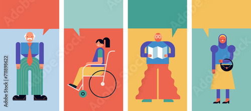 © Marina Zlochin, Fototapeta premium People with speech bubbles, community, family or neighborhood standing together. Characters in geometric fun modern style. Colorful concept design.