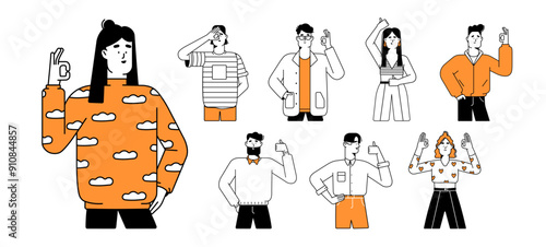 © Paper Trident, Fototapeta premium People with thumb up or Ok finger sign set. Happy men and women showing approval hand gestures: okay, yes, good, excellent. Nonverbal communication. Flat isolated outline vector illustrations on white