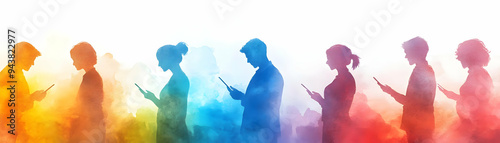 © GG Kenji, Fototapeta premium People with Watercolor Business Partnerships and Smartphones concept as A group of people forming watercolor business partnerships with smartphones set against a dreamy background offering ample space