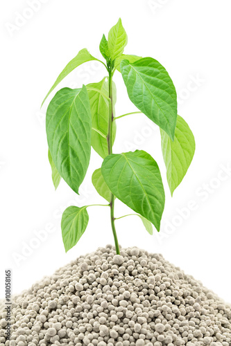 © hemerocallis, Naklejka premium Pepper seedling closeup on the mineral fertilizers. Isolated on white