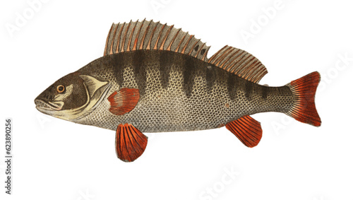 Naklejka premium Perch fish on 17th century hand colored etching.