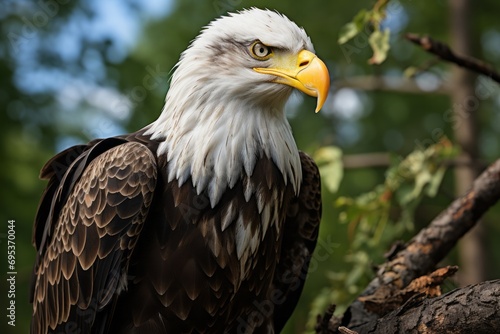 Fototapeta premium Perched bald eagle surveying its territory from a tall tree, Generative AI