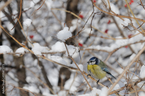 Naklejka premium Perching Blue Tit at snowy snowball tree