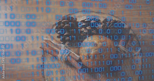 Fototapeta premium Perching pair of parrots showing warm brown plumage on wooden slatted wall, binary overlay