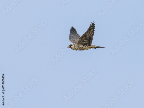 © Anders James, Fototapeta premium Peregrine Falcon in flight against clear blue sky