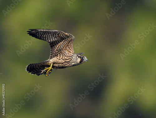 © FotoRequest, Obraz premium Peregrine Falcon with prey flying on green brown background