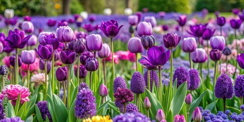 Naklejka premium Perennial flower bed bursting with various shades of purple flowers and bulbs, perennial, flower bed, purple, garden, park