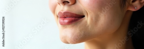 © Olga, Obraz premium Perfect lips of an Asian girl, lipstick color Mocha mousse. Smile. Close-up. Natural beauty