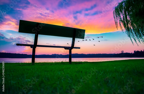 © Joshua, Obraz premium Perfect Park Bench At Sunset Outdoors