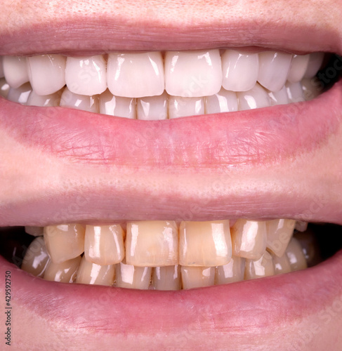 Fototapeta premium Perfect smile before and after veneers bleach of zircon arch ceramic...