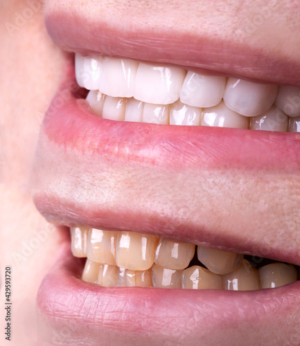 Fototapeta premium Perfect smile before and after veneers bleach of zircon arch ceramic...