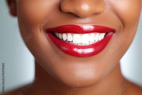 © FoxTok, Obraz premium Perfect snow-white smile of an African-American girl with red lipstick on her lips close-up. Dental care concept, whitening, dentistry. Beautiful smile of a happy woman