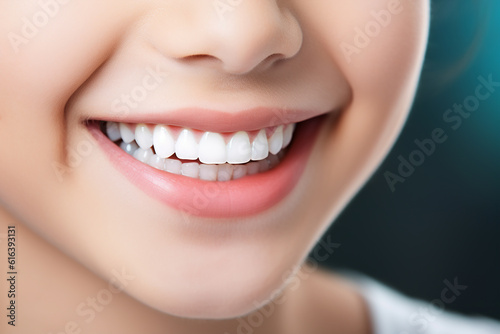 Obraz premium Perfect white skin toddler smile with beautiful white milk tooth. Generative AI