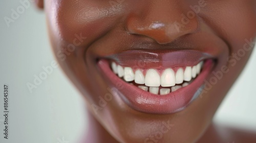Obraz premium Perfect white teeth African American black girl close up. Female toothy...