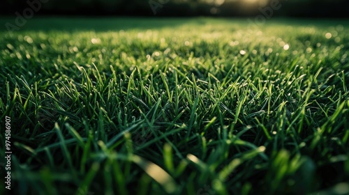 © Suphawan, Fototapeta premium Perfectly maintained green grass lawn with short blades, evenly spaced and illuminated by soft natural light.