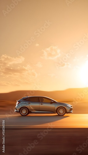 Fototapeta premium Performance hatchback in motion on desert road at golden hour