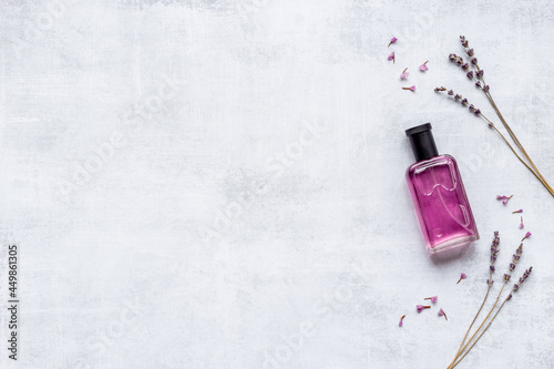 Fototapeta premium Perfume bottle with aroma flowers and leaves